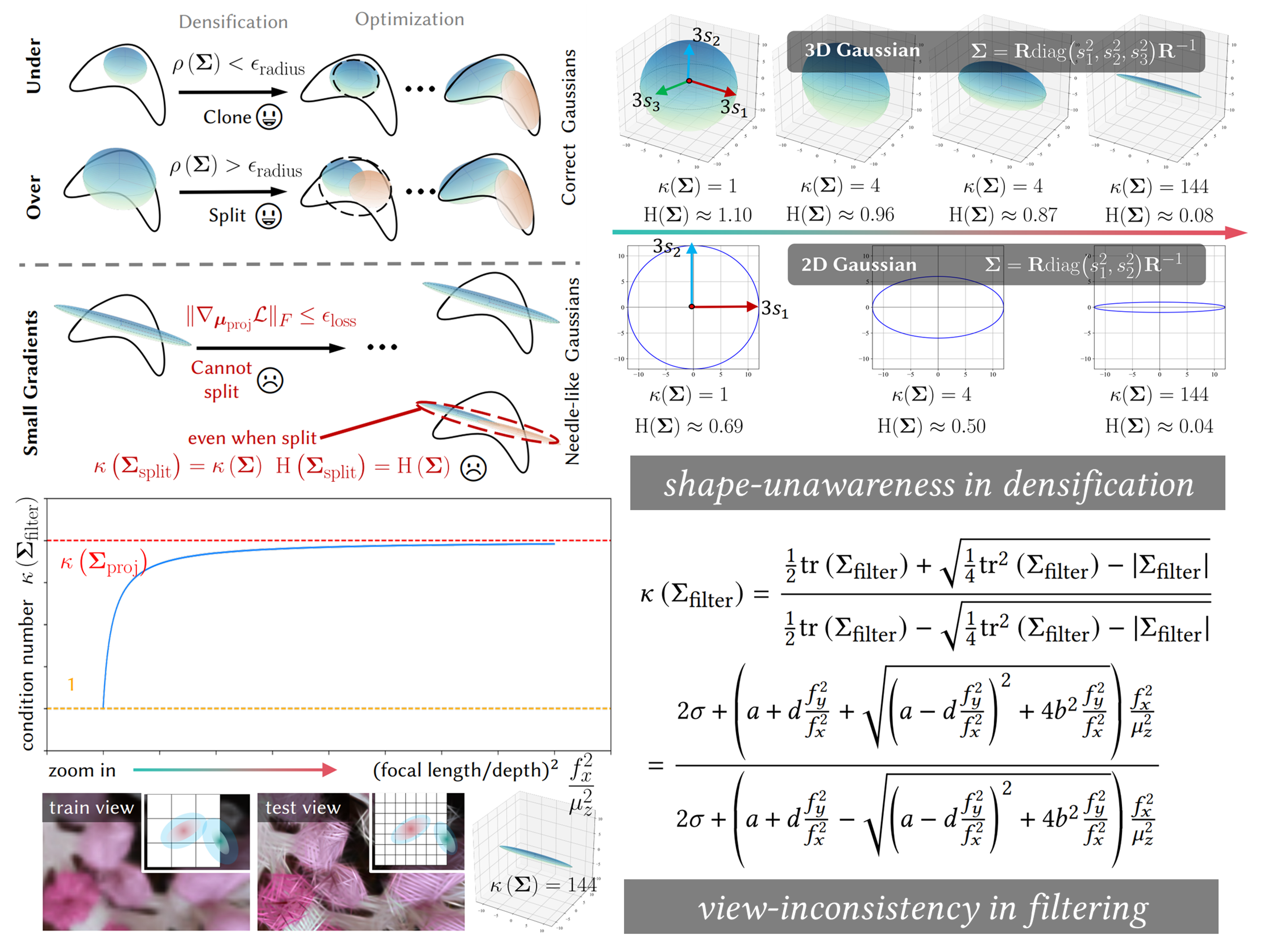 Overview of Spectral-GS. 3D Gaussian Splatting (3DGS) [Kerbl et al. 2023] decides whether to split based on the positional gradients and the spectral radius of the covariance matrix without considering the shape of primitives. We propose the 3D shape-aware splitting strategy based on the spectral analysis (3D Split). In screen space, both the EWA filter [Zwicker et al. 2002] of 3DGS which attempts to cover an entire pixel, and the Mip filter of Mip-Splatting [Yu et al. 2024] which approximates supersampling, result in a reduction of spectral entropy when zooming in to synthesize novel view. Our view-consistent filter’s kernel is not constant to maintain the spectral entropy consistency (2D Filter).